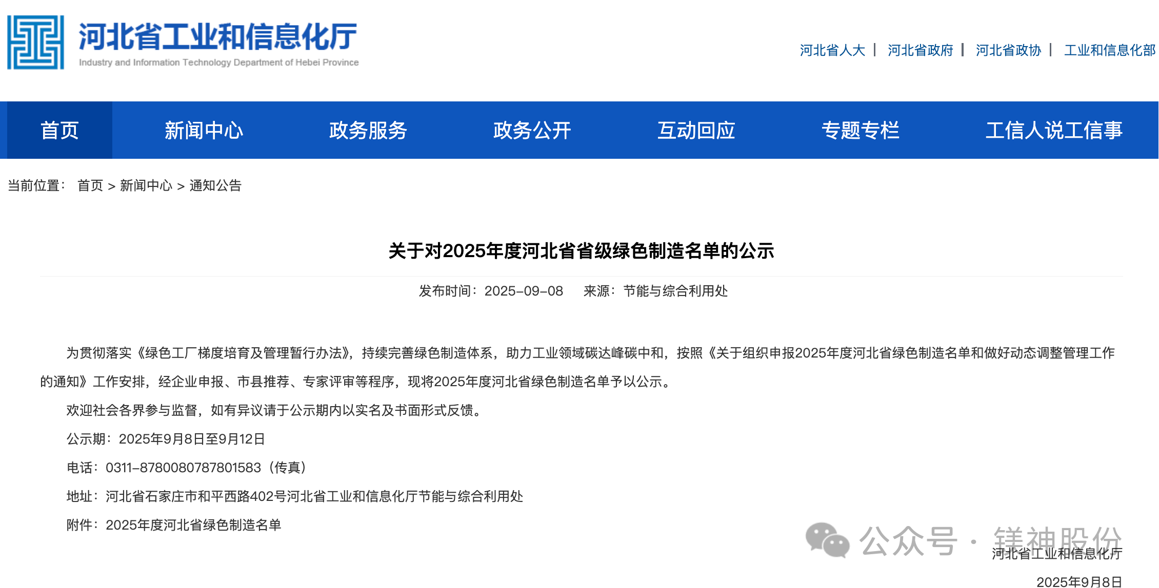2025年9月8日,河北省工業(yè)和信息化廳正式公布了2025年河北省綠色制造名單。河北鎂神科技股份有限公司(以下簡(jiǎn)稱(chēng)“鎂神科技”)憑借在綠色制造、節(jié)能降耗、清潔生產(chǎn)等方面的突出表現(xiàn),成功入選“2025年度河北省綠色制造名單”!這是公司積極踐行綠色發(fā)展理念、扎實(shí)推進(jìn)綠色體系建設(shè)取得的重大成果,也是對(duì)鎂神科技綠色制造水平和可持續(xù)發(fā)展能力的認(rèn)可!
